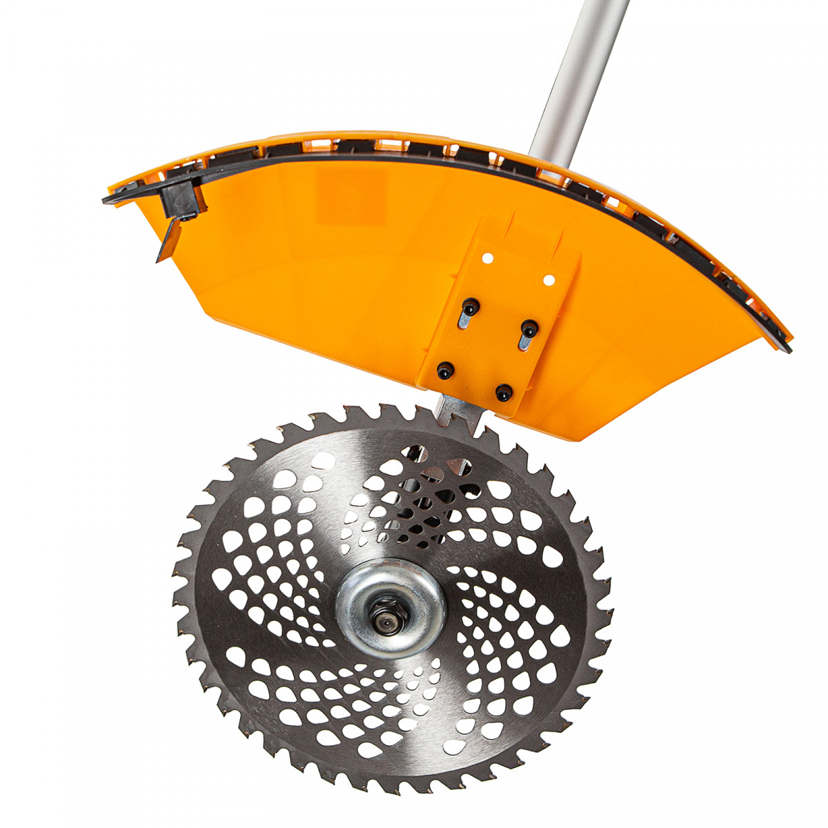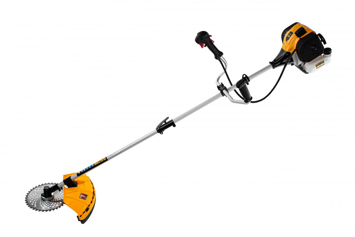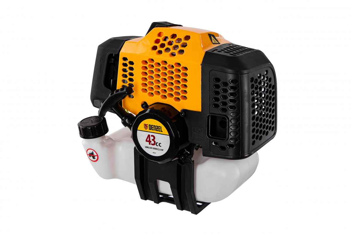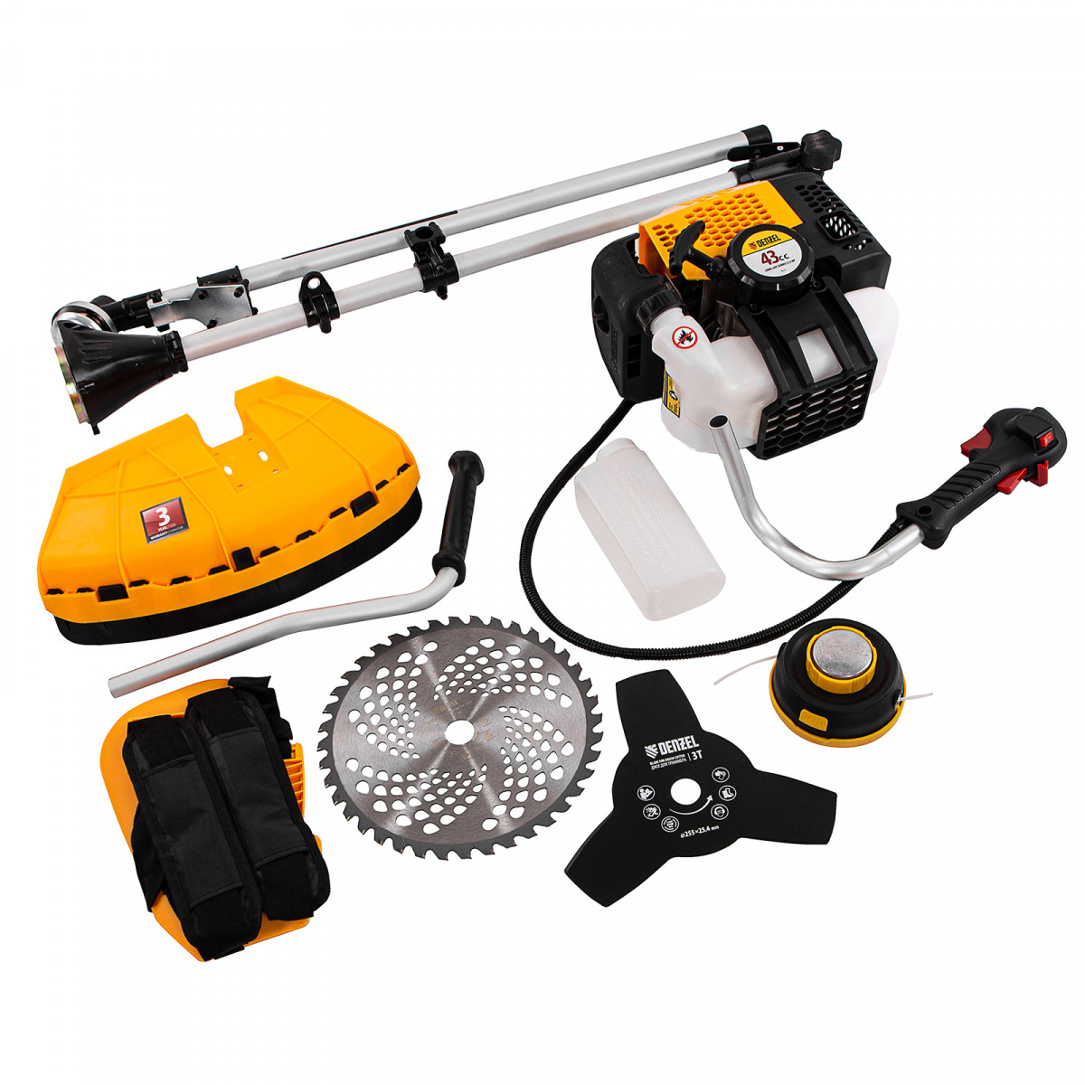 Бензиновый триммер Denzel DGT 430S 96237 с двигателем объемом 43 см3, мощностью 2,5 л. с., с разъемной штангой, состоит из 2 частей. Оптимально подходит для ухода за газоном, скашивания травы всех типов, в том числе с жесткими стеблями (полыни, крапивы, лебеды), борьбы с борщевиком, а также срезания кустарника и молодых побегов деревьев с диаметром стволов до 10 мм. Триммером удобно работать в недоступных для колесной газонокосилки мест: вокруг деревьев, около стен и заборов, у кромок дорожек. Экономичный двигатель мощностью 2,5 л.с. отличается высоким ресурсом и долговечностью. Триммер комплектуется 3 оснастками: усиленной полиамидной катушкой, трехлопастным ножом и пильным диском.
