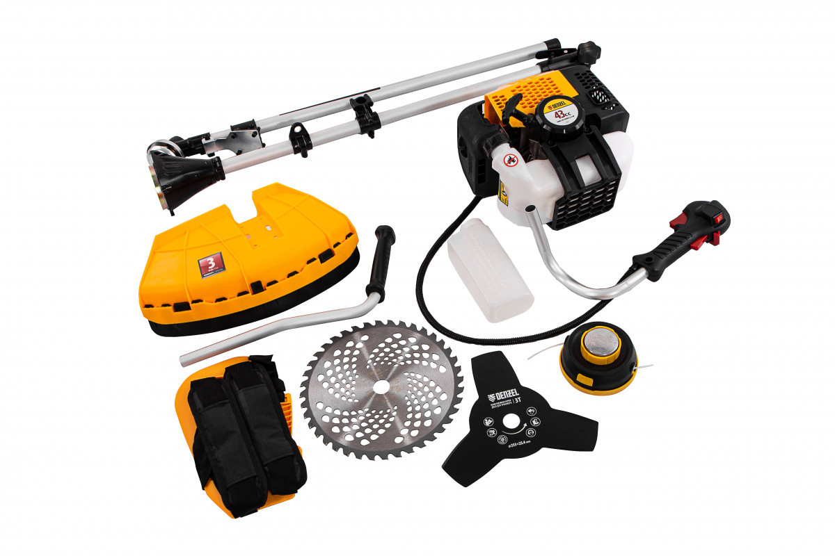 Триммер бензиновый - 1 штКатушка - 1 штНож трехлопастной 3Т - 1 штПильный диск 40Т - 1 штДвухплечевая подвесная система с защитой бедра - 1 штДозатор для приготовления смеси - 1 штНабор крепежа - 1 штНабор инструментов - 1 штРуководство по эксплуатации с гарантийным талоном - 1 штДозатор для приготовления топливной смеси - 1 шт
