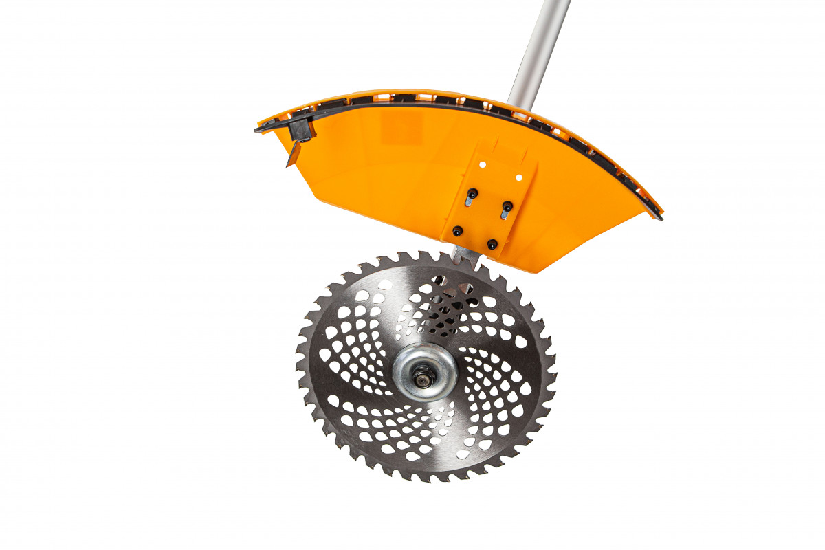 • Дополнительные возможности — можно приобрести и установить на триммер диск Denzel 96323 для быстрого удаления растительности с жесткими стеблями, 96328 для скашивания молодых побегов кустарника диаметром до 3 мм.