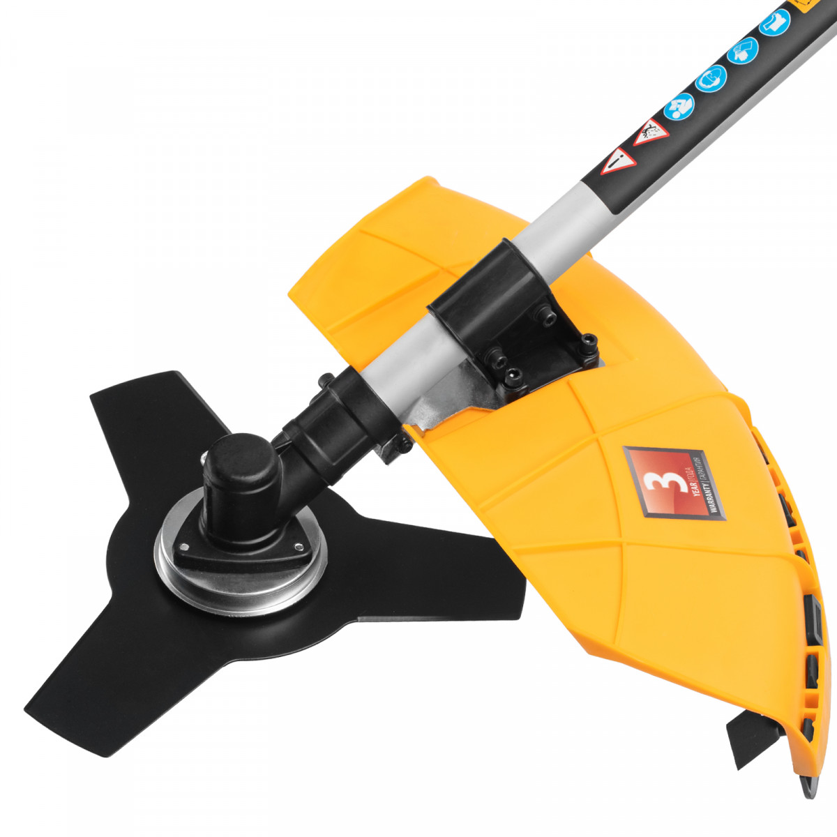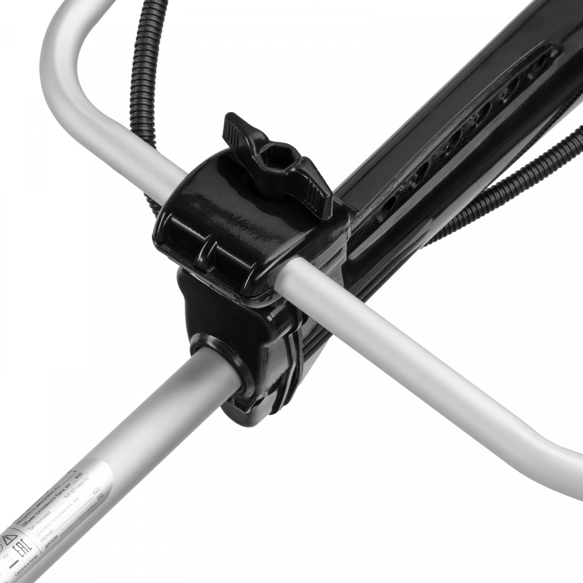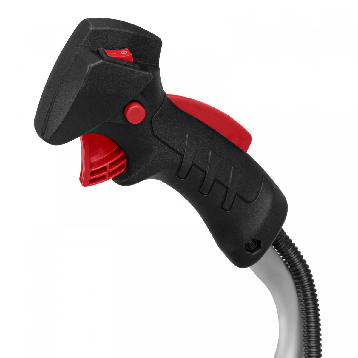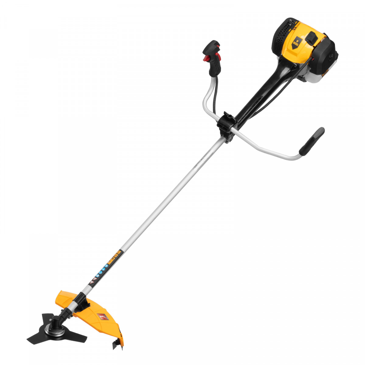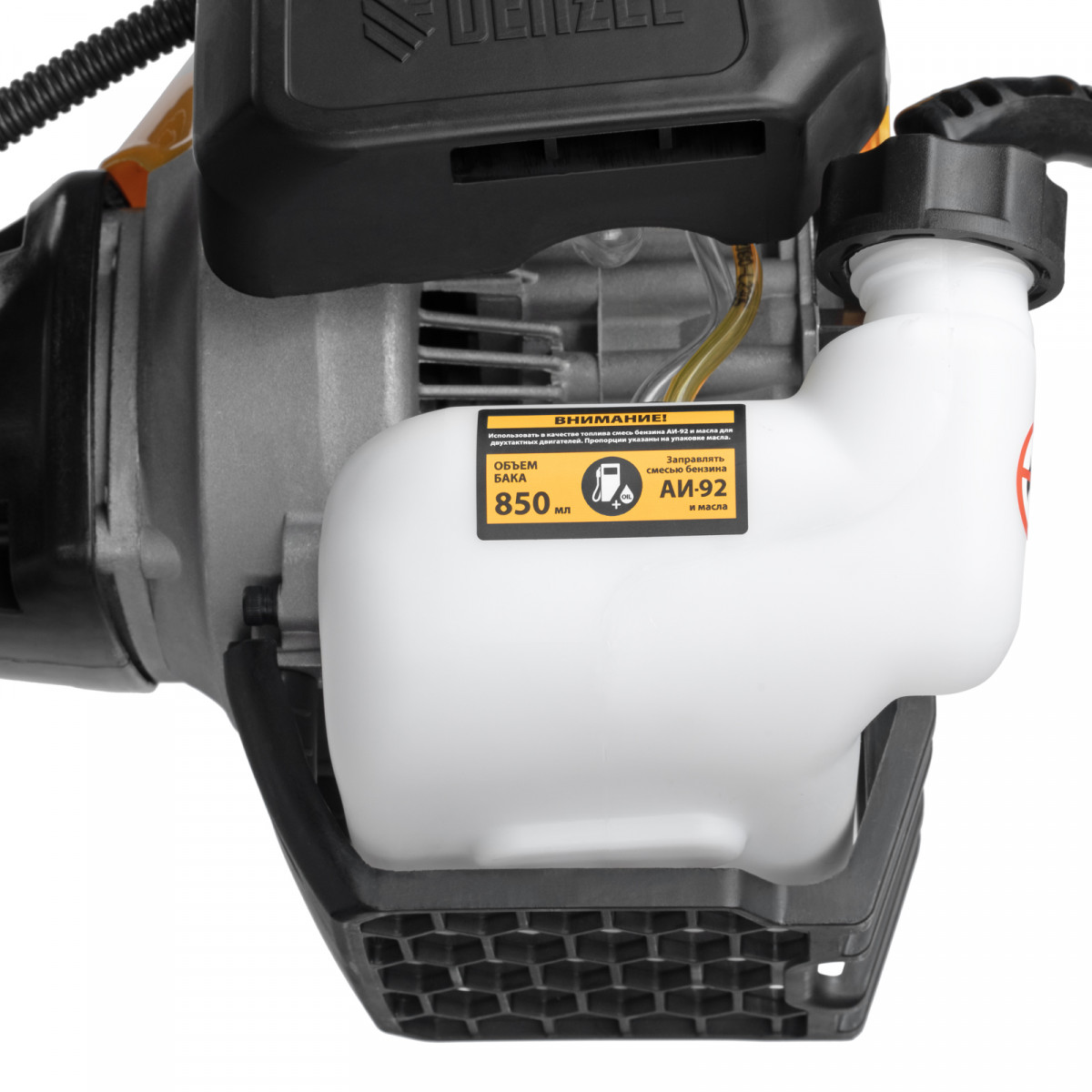 • Безопасность — защитный кожух из прочного пластика закрывает режущую часть, а блокиратор курка газа исключает случайный запуск двигателя.
