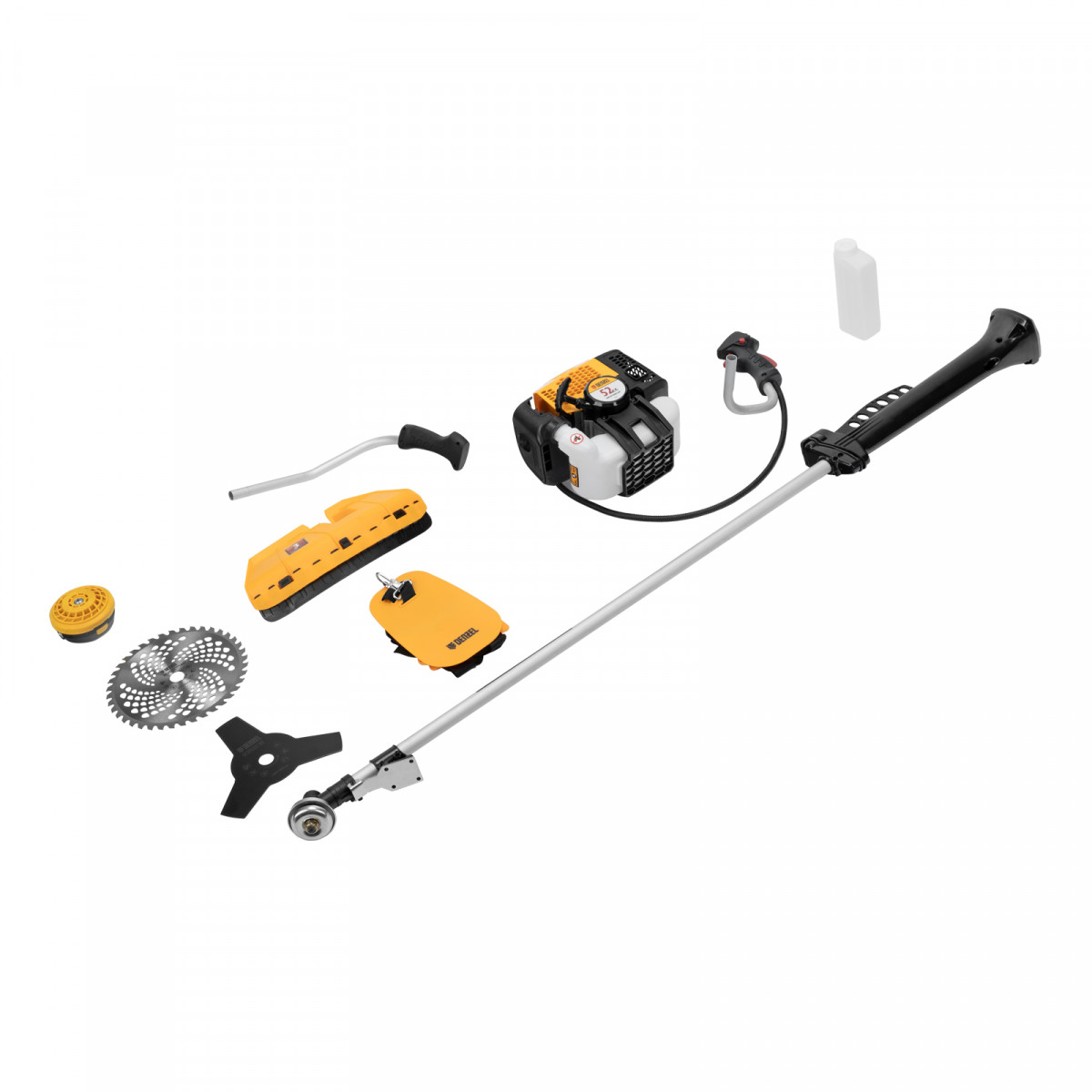 Триммер бензиновый - 1 штКатушка - 1 штНож трехлопастной 3Т - 1 штПильный диск 40Т - 1 штДвухплечевая подвесная система с защитой бедра - 1 штДозатор для приготовления смеси - 1 штНабор крепежа - 1 штНабор инструментов - 1 штРуководство по эксплуатации с гарантийным талоном - 1 штДозатор для приготовления топливной смеси - 1 шт