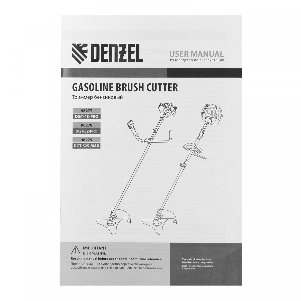 Триммер бензиновый DGT-52-PRO, анти-вибро, 52 см3, неразъем, состоит из 2 частей Denzel