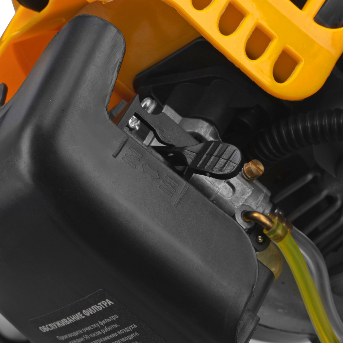 - Безопасность — блокиратор курка газа препятствует случайному запуску двигателя, прочный пластиковый кожух защищает пользователя от летящей травы, грязи и прочих твердых частиц.