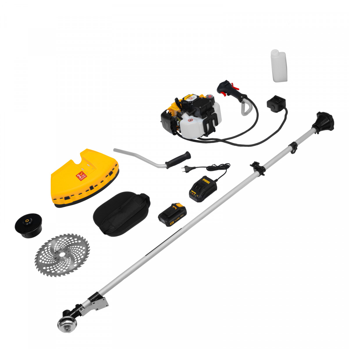 - Полный комплект поставки — аккумулятор, зарядное устройство и удобный дозатор для приготовления топливной смеси прилагаются к триммеру.