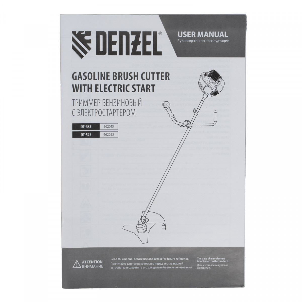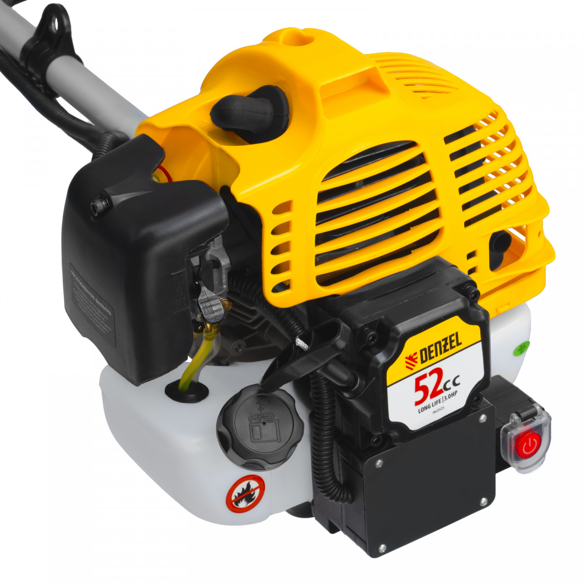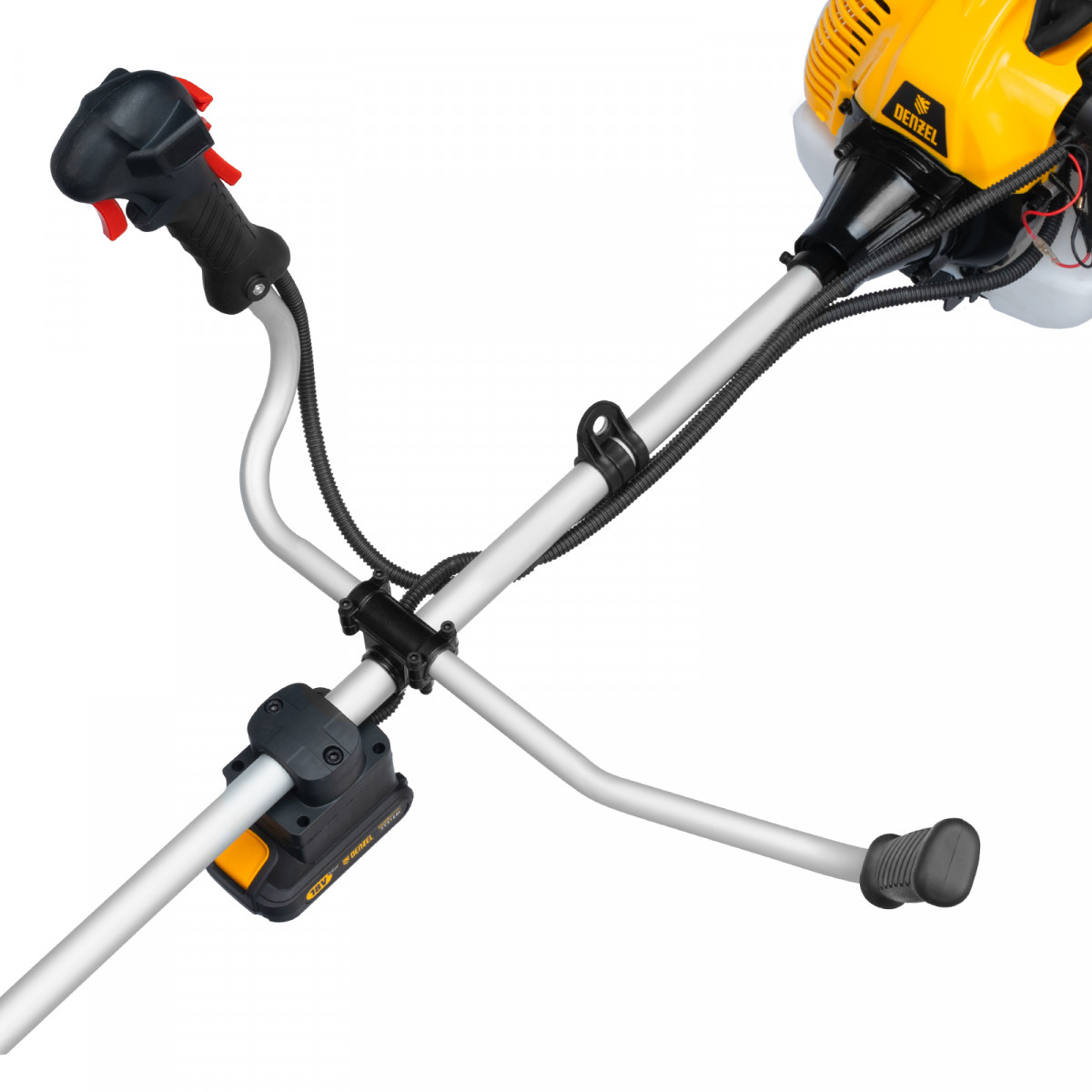 Триммер бензиновый DT-52E, 52 см3, неразъемная штанга, электростартер, состоит из 2 частей Denzel