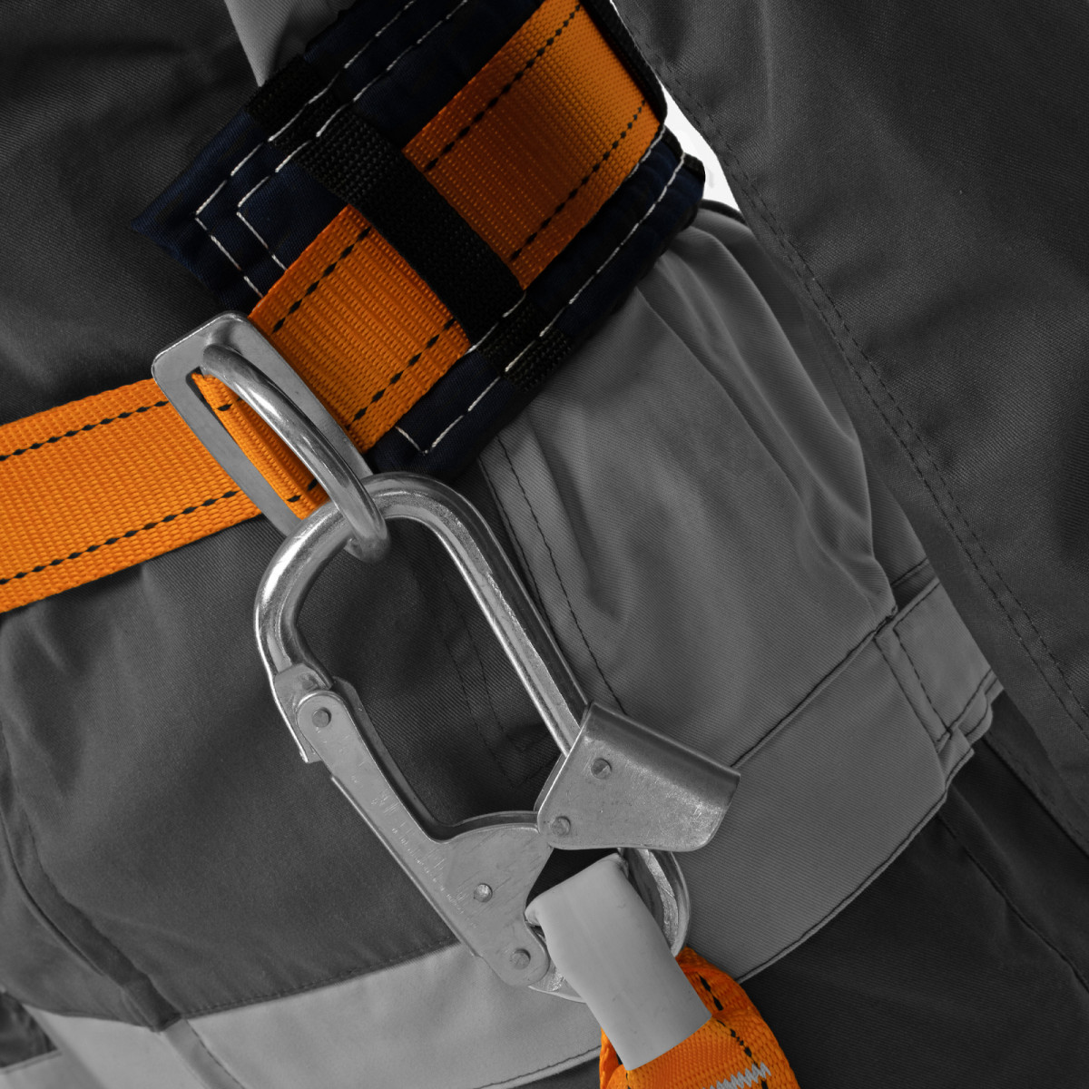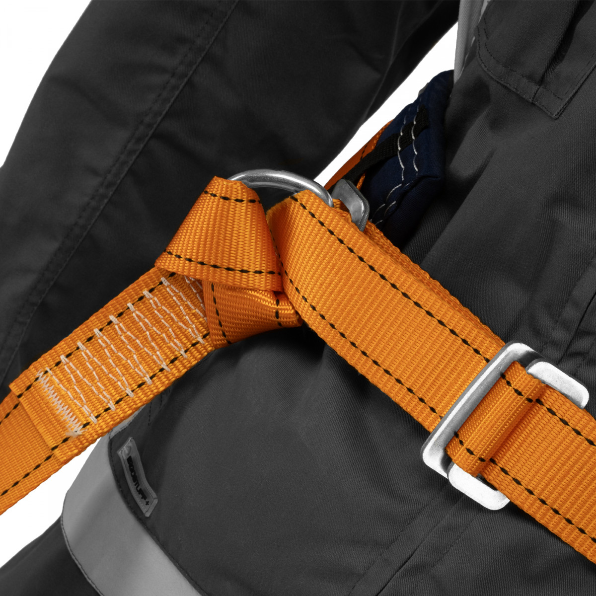 - Надежная страховка — привязь снабжена большим карабином и двумя прочными металлическими D-образными кольцами.