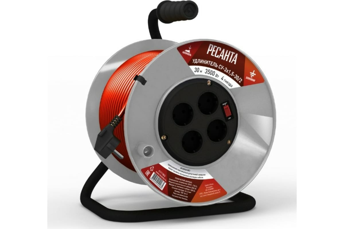 Удлинитель силовой на катушке СУ-3х1,5-30/2 с выключателем 4 розетки РЕСАНТА