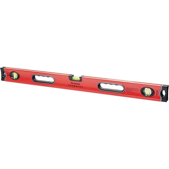 Алюминиевый уровень Matrix 34306 длиной 800 мм, с 3 глазками, ударопрочными заглушками и двухкомпонентными ручками, повышает точность работы, т. к. позволяет обнаружить отклонения от вертикали, горизонтали и угла 45°. Используется для монтажа конструкций, укладки покрытий, облицовки поверхностей и т. д., подходит для профессионального и бытового применения.