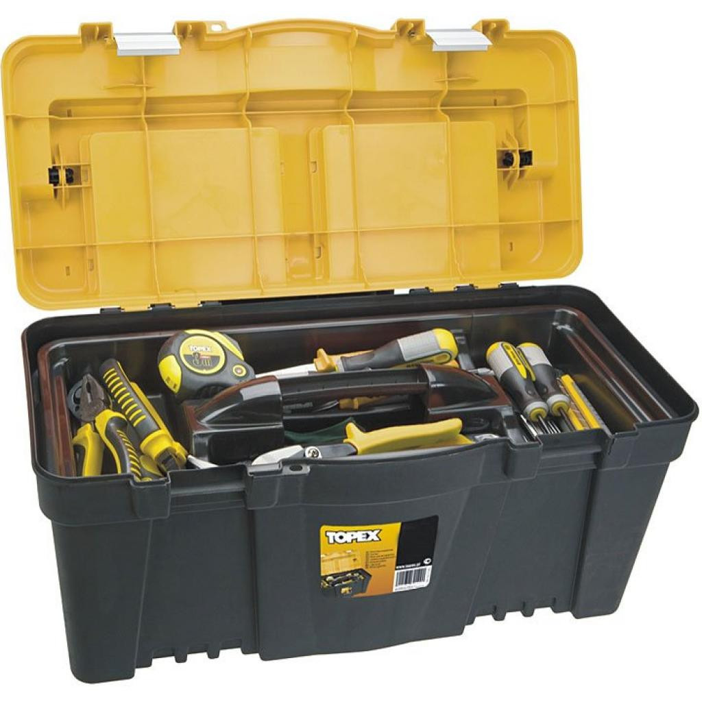 Ящик для инструмента TOPEX 22" 79R128 используется для хранения и транспортировки ручного инструмента. На крышке расположены 2 практичных органайзера для хранения мелочей. При изготовлении используется прочный пластик, обеспечивающий длительный срок эксплуатации. Застежки и ручка выполнены из алюминия. Предусмотрены петли для навесного замка.