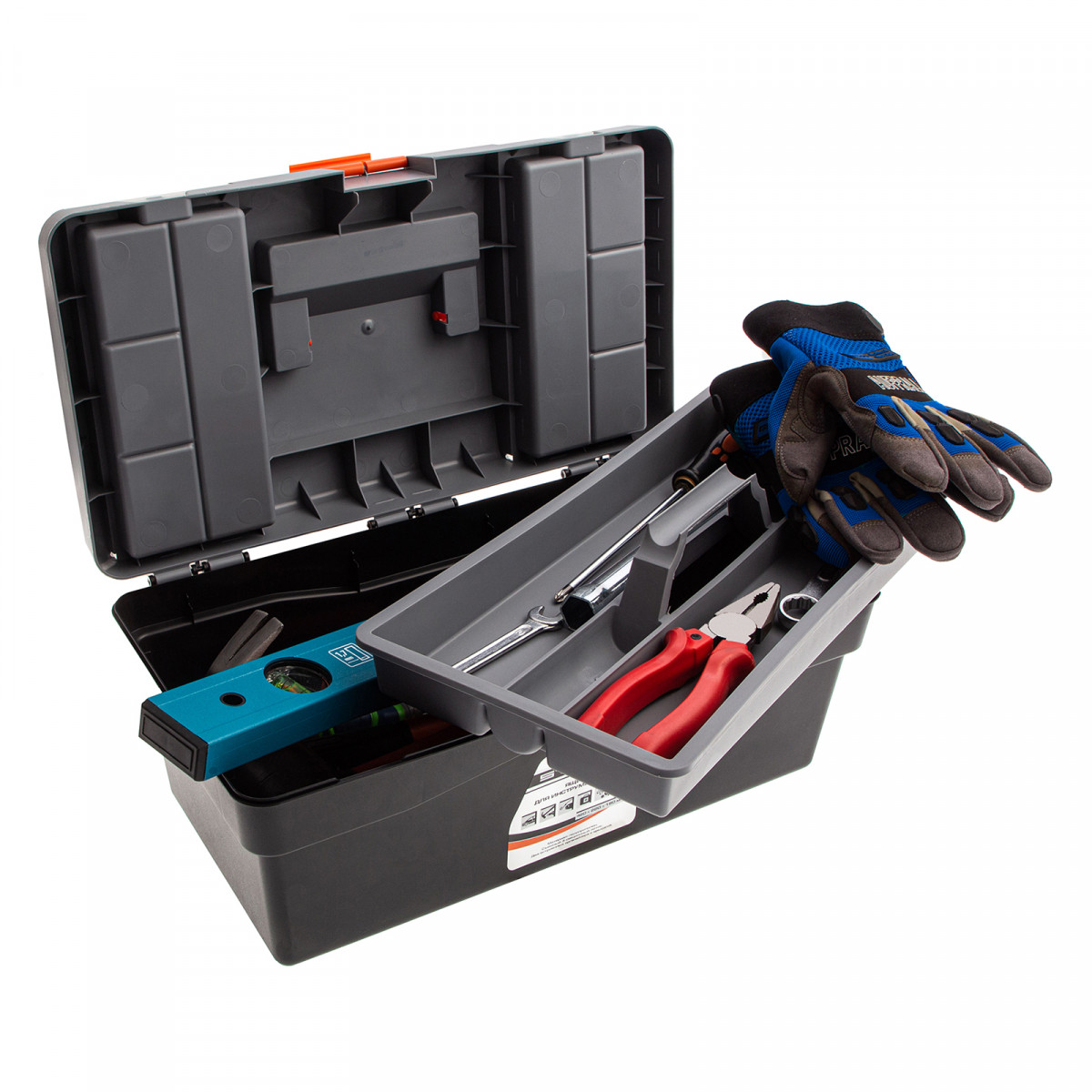 Ящик для инструмента Stels 90704 из пластика, длиной 17", габаритами 420 х 220 х 180 мм, предназначен для переноски и хранения инструментов, хозяйственных мелочей, рыболовных снастей. Крышка надежно закрывается, поэтому содержимое не рассыплется. Встроенные в крышку отделения обеспечивают быстрый доступ к крепежам и другим необходимым предметам. Большой ящик для хранения инструментов будет полезен дома, на даче, в гараже и на рыбалке.