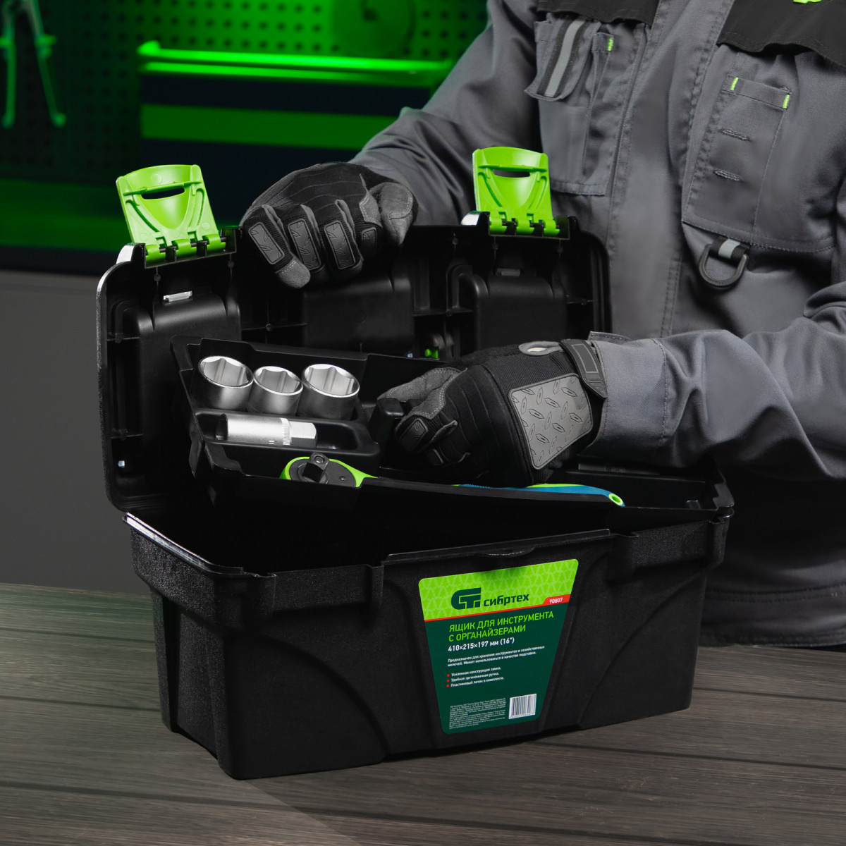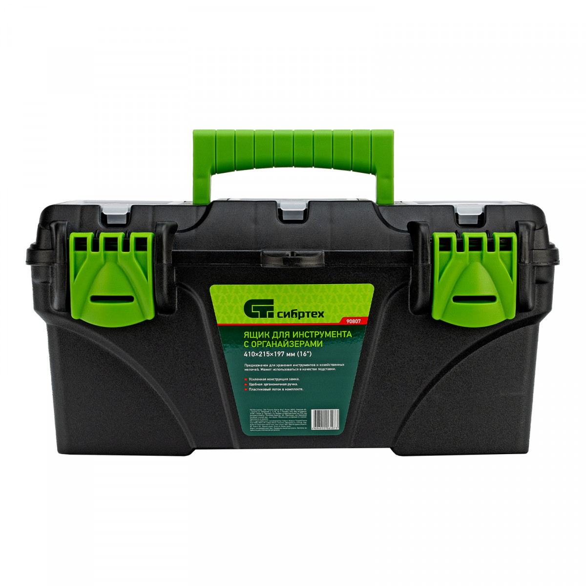 Ящик Сибртех 90807 длиной 16", с органайзерами, используется для хранения и транспортировки инструментов, оснастки, крепежа, хозяйственных мелочей и других предметов. Крышка и замок усилены трехрядными петлями, поэтому ящик выдерживает вес содержимого до 30 кг. Съемный лоток позволяет оптимизировать пространство внутри ящика. Его можно брать в поездку, также он пригодится дома, на даче или в гараже.