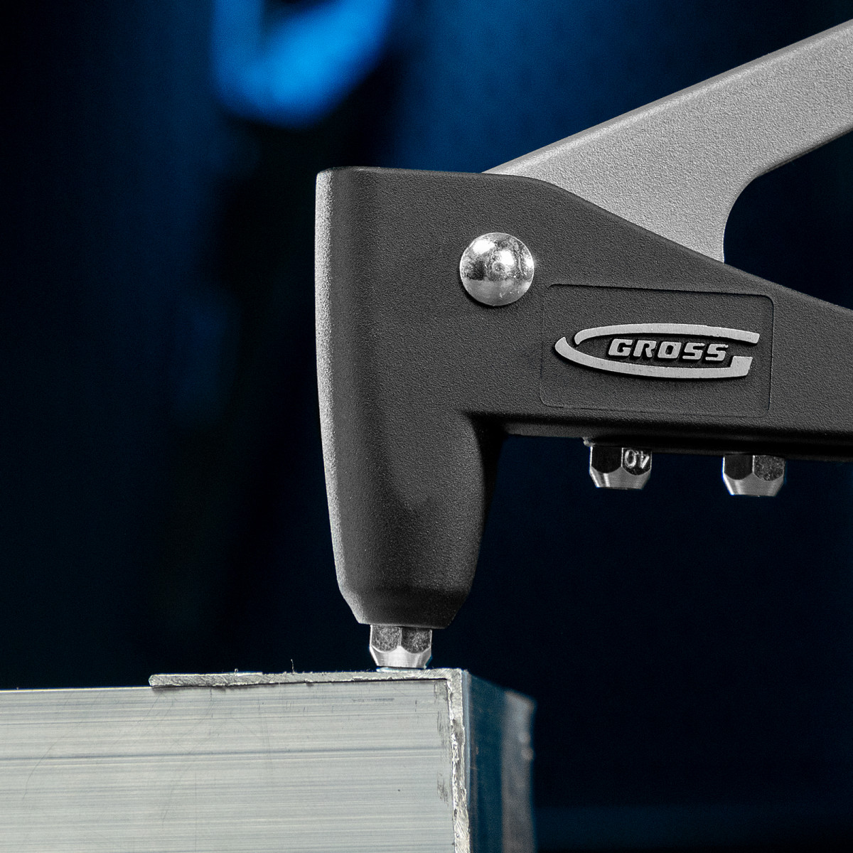 Литой заклепочник Gross 40401 надежно соединяет листовые заготовки при помощи алюминиевых и стальных заклепок размером от 2,4 до 4,8 мм, а также заклепок из нержавеющей стали диаметром 2,4-3,2 мм. В комплекте имеются сменные головки соответствующих размеров. Неиспользуемые насадки располагаются в корпусе инструмента, а значит, не придется тратить время на их поиск. Заклепочник рекомендован для профессионального применения, а также может быть полезен в быту.