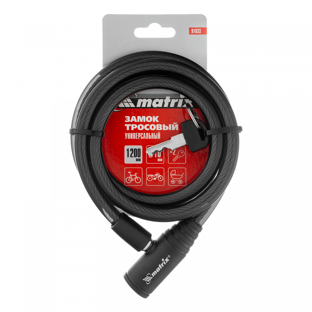 Универсальный тросовый замок Matrix 91833 размером 10 х 1200 мм позволяет обезопасить имущество от кражи. С его помощью можно пристегнуть велосипед, мопед, коляску и другие транспортные средства к неподвижной опоре, а также защитить помещение от взлома.