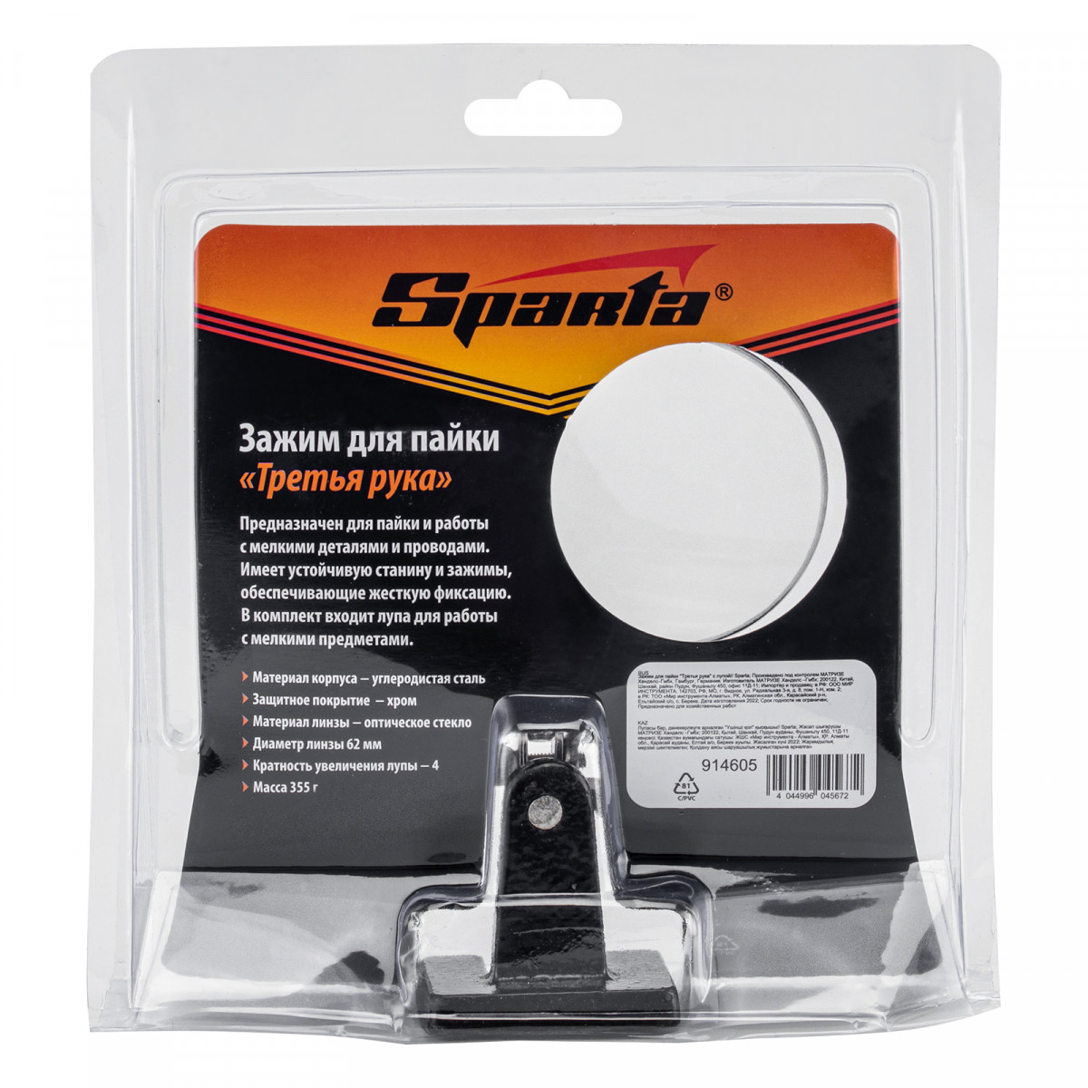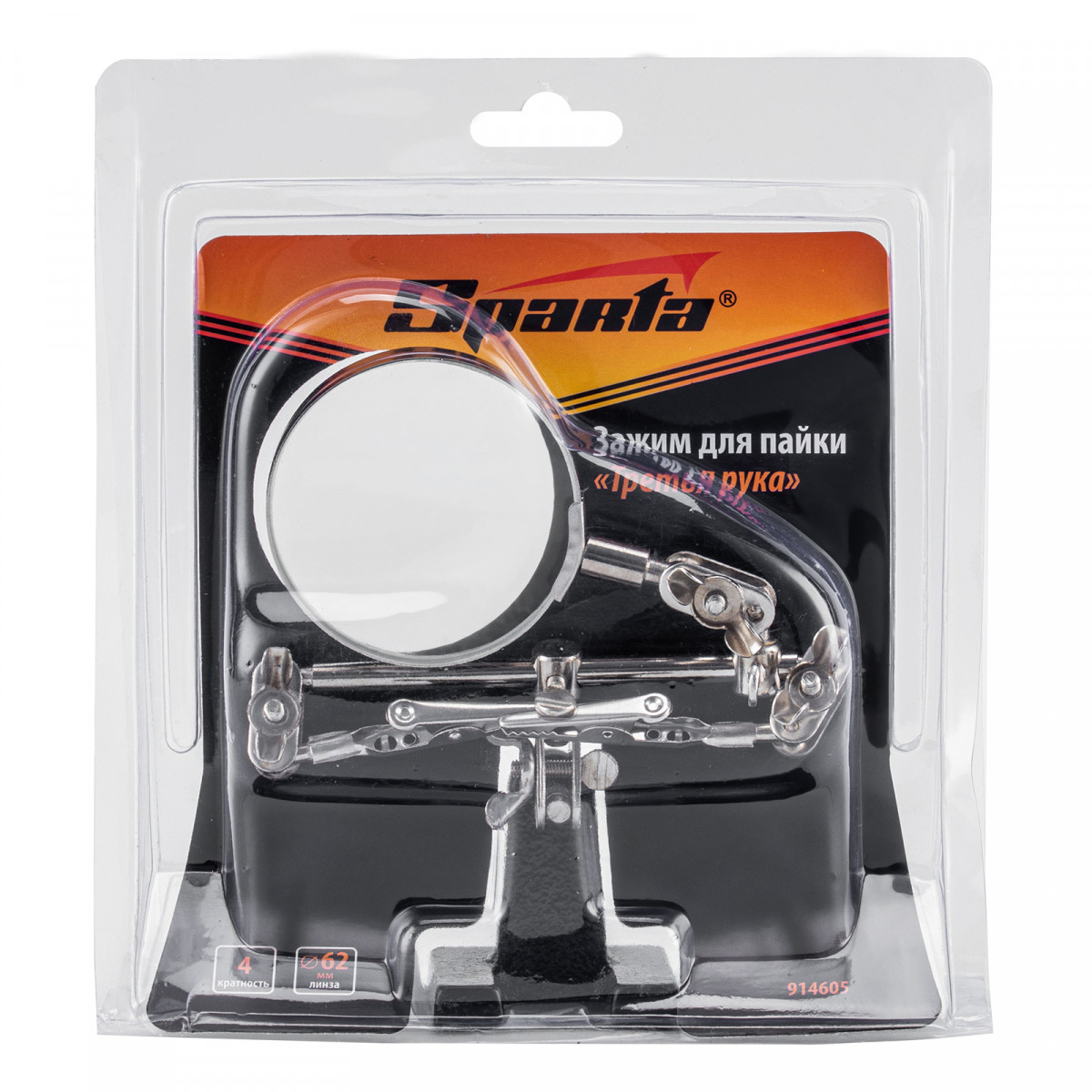 Зажим для пайки Sparta «Третья рука» 914605 предназначен для надежной фиксации плат, проводов и мелких деталей при пайке. Лупа с 4-кратным увеличением позволяет проводить микропайку с высокой точностью. Зажим будет полезен электрикам, мастерам по ремонту техники, а также пригодится в бытовой сфере.