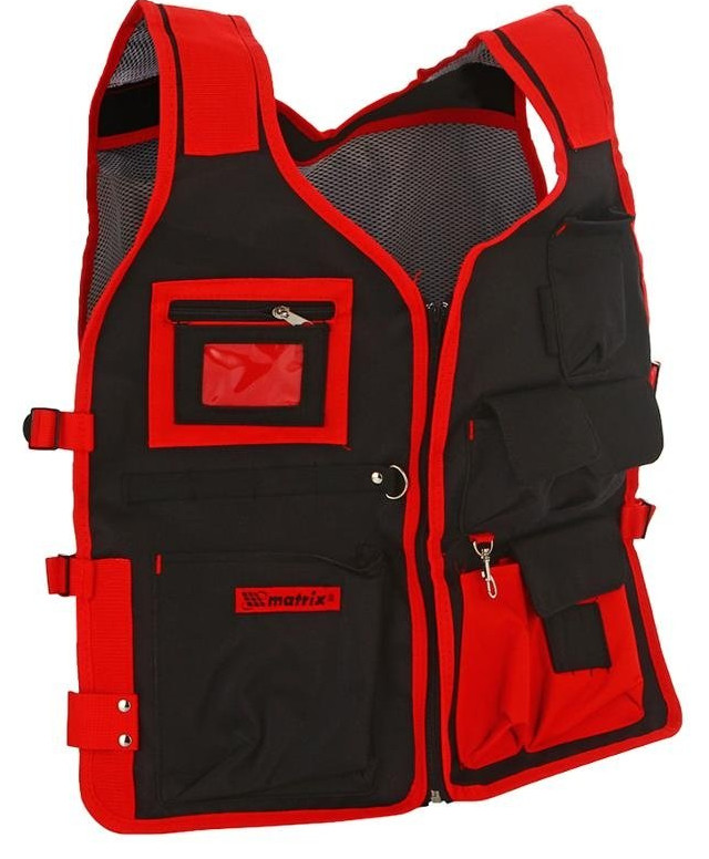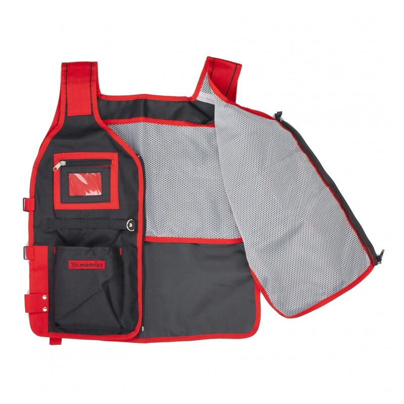 Универсальный размер благодаря двойным боковым застежкам. Большое количество карманов разного размера для хранения инструментов и мелких деталей. Вставка из сетчатой ткани на спинке для предотвращения прилипания к спине. Прозрачный карман для удостоверений. Устойчив к воздействию влаги, химических веществ и низких температур. Изготовлен из прочного синтетического материала.