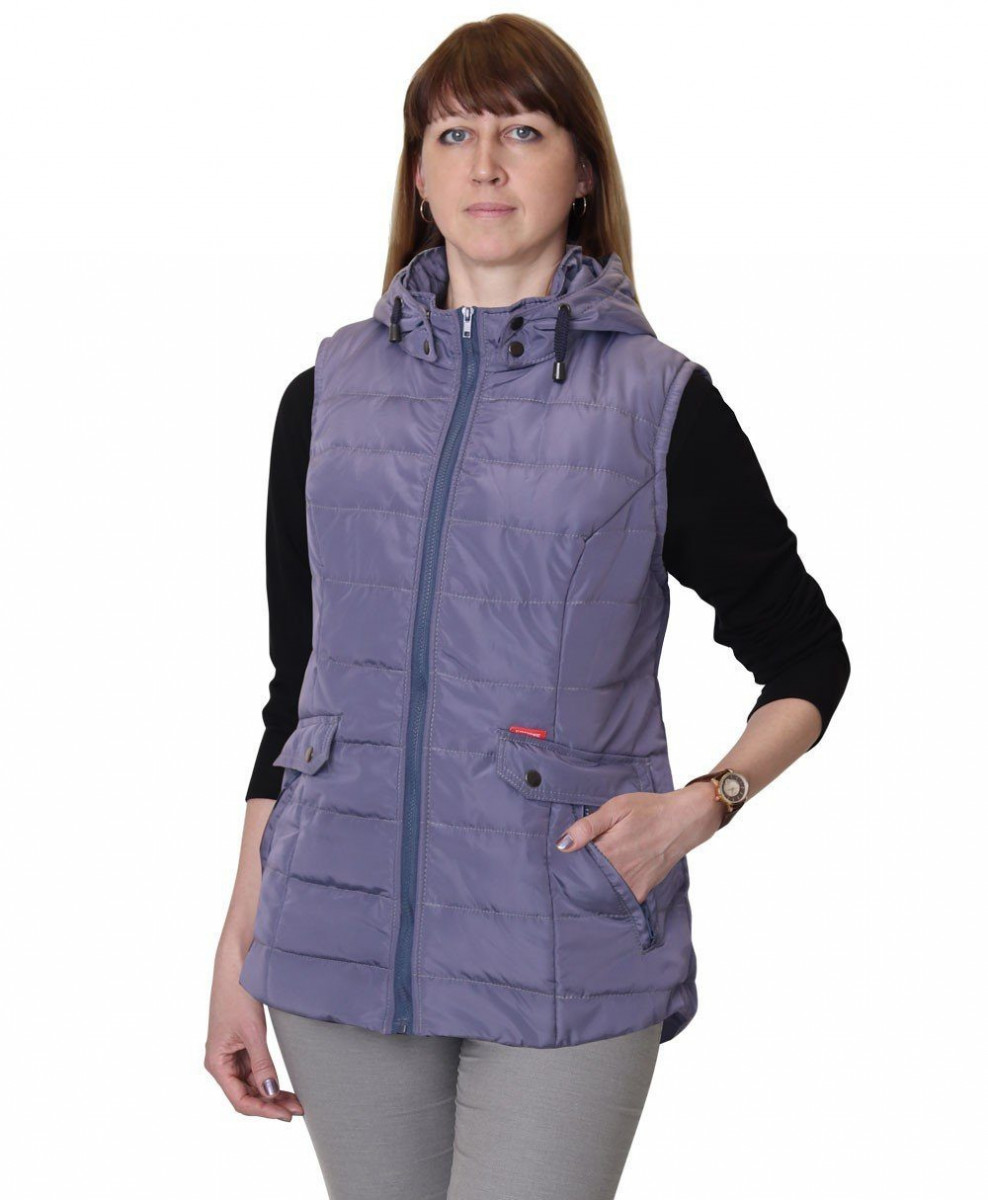 Жилет утеплённый с воротником стойка, с центральной застёжкой на тесьму "молния" до верха, с пристёгиваемым капюшоном. Полочка с двумя нижними карманами с клапанами, спинка удлинённая.