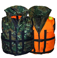 Жилет спасательный «Капитан» (двусторонний). Цвет: с одной стороны – сигнальный, с другой – маскировочный (КМФ). При одевании любой стороной владелец получает полноценный спасательный жилет с наличием карманов, в т.ч. закрытых молниями. Удобный подголовник защитит голову от травм и удержит на воде в нужном положении. Снабжен свистком. Размер: супер на 120 кг.