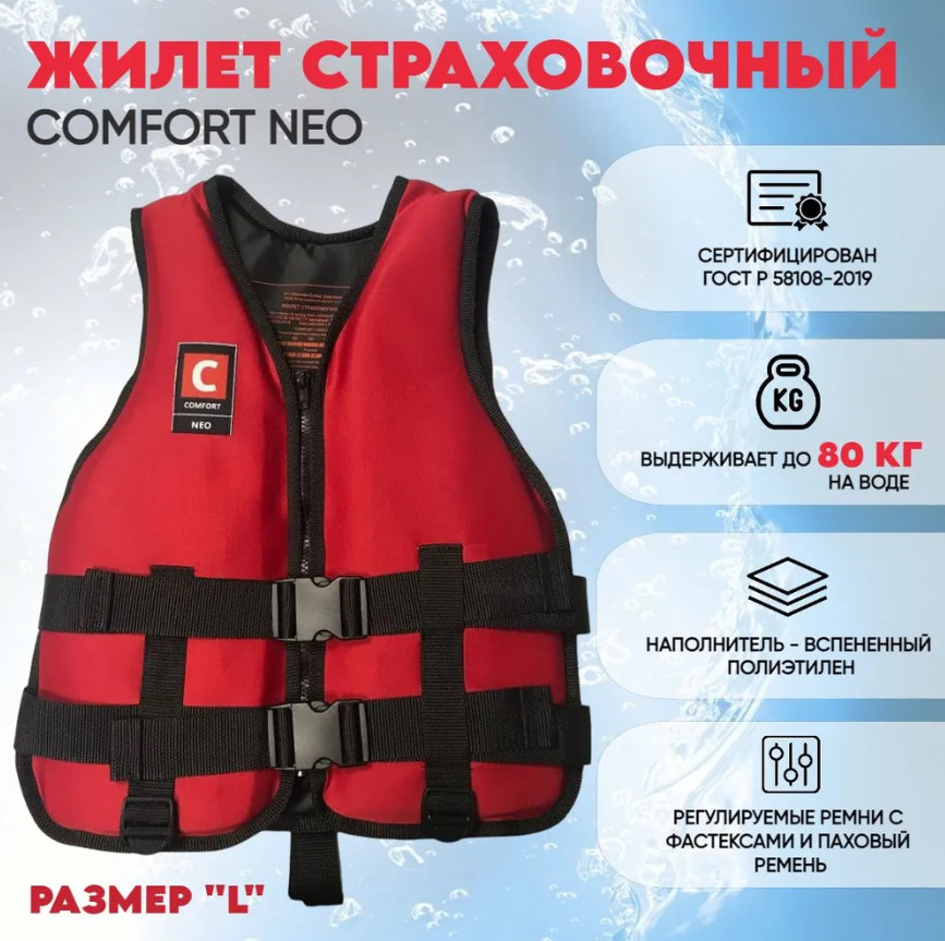 Страховочный жилет Comfort "NEO" изготавливается согласно ГОСТ Р 58108-2019. Эргономичная форма и легкий эластичный неопрен обеспечивают комфортную посадку без чувства стеснения в движениях. Материал: эластичный неопрен толщиной 2мм. Материал блоков плавучести: вспененный полиэтилен. Мягкий, эластичный и  не впитывает воду! Сохранит плавучесть даже при длительном нахождении в воде.